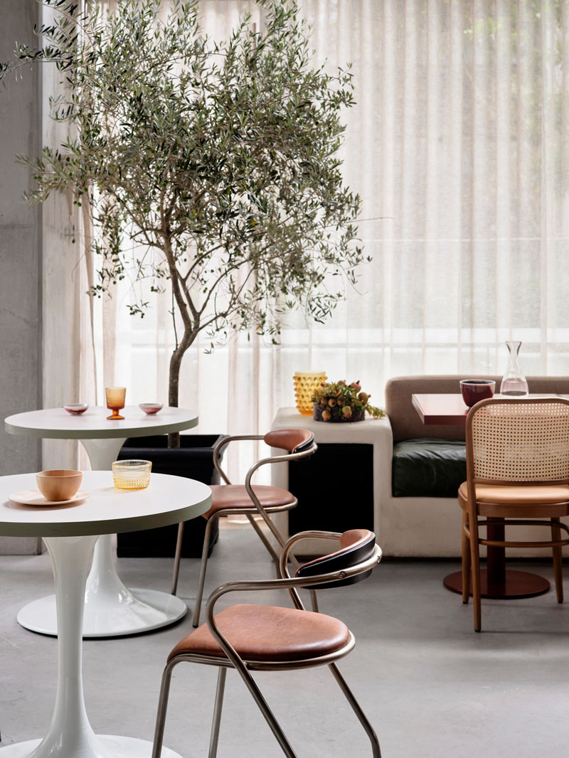 Para apoyar esta idea, el uso inteligente de cinco modelos de asientos definió aún más cada zona. Las variadas opciones de asientos ofrecen intimidad y opciones dependiendo de las necesidades de los clientes a la hora de comer o beber. El uso de las altas mesas de madera, los taburetes del bar, las largas mesas comunitarias, las banquetas de cuero verde oliva, las mesas de tonos rojo óxido y las sillas individuales de madera curvada crean una mezcla moderna pero con un punto tradicional necesario en la idea del proyecto.