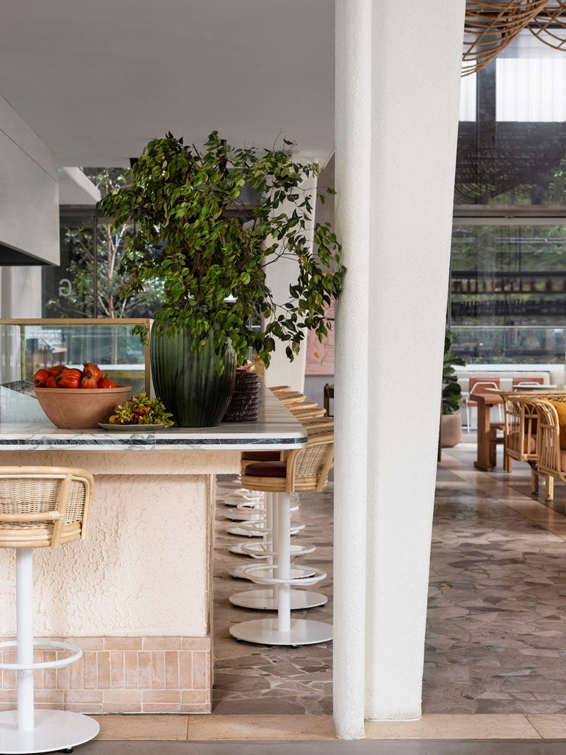 Se utilizó, desde cemento pulido alrededor del bar y áreas de comedor hasta tableros de madera en el comedor central o losas de cemento que rodean la cocina. Cada variación en los materiales ayudó a distinguir cada zona, así como a construir personalidad e interés. La gran escala, el volumen, la vista y el área elevada del piso también se convirtieron en ventajas para crear una espacialidad y singularidad en todo el lugar.