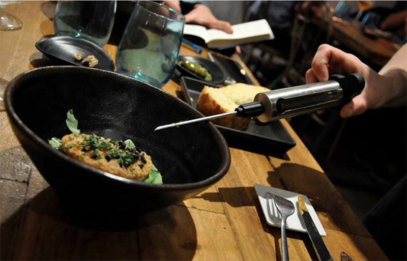 Imagen superior: empanadillas de conejo con salmorejo canario inyectado en el momento