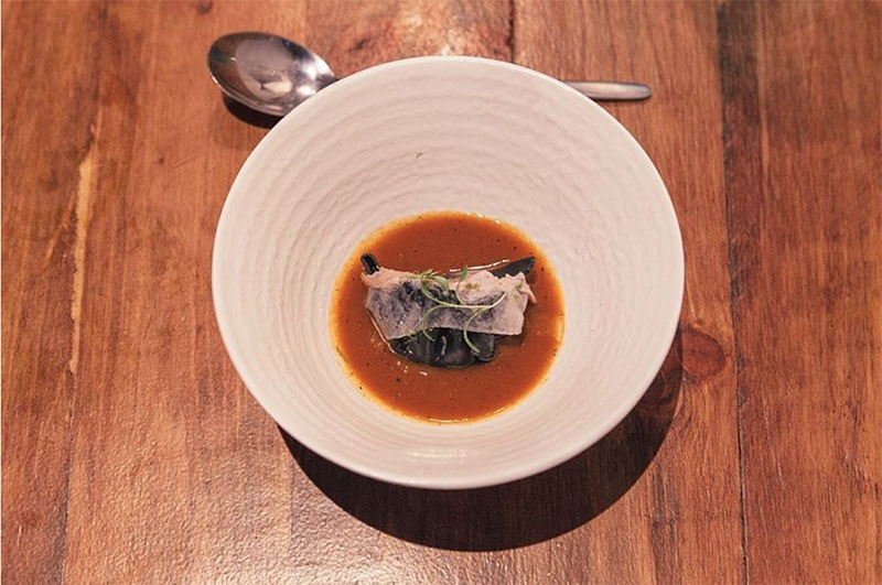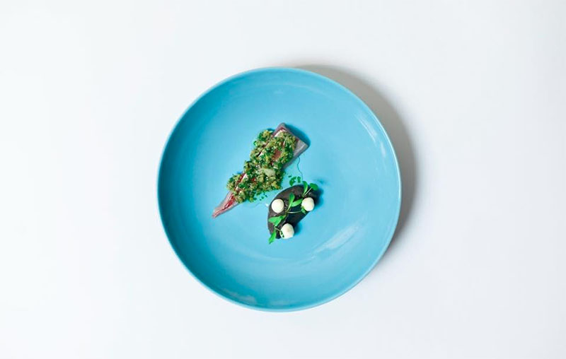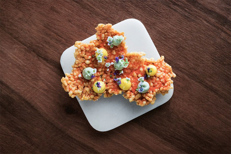 Imagen superior: chicharro curado en mojo de cilantro a mortero con merengue de fruta de la pasión y huevas de arenque