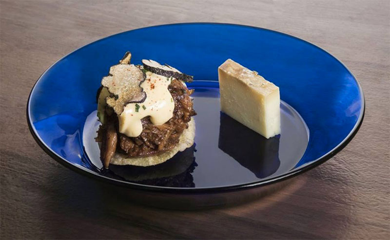 Imagen superior: tosta de cabrito embarrado, crema agria y holandesa de mantequilla de cabra canaria con queso artesano de Gran Canaria y trufa de verano