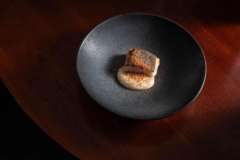 Lubina de Aquanaria, cocinada en su propia grasa, con una emulsión de cabeza, cola y espinas, para acabar con sus huevas ralladas.