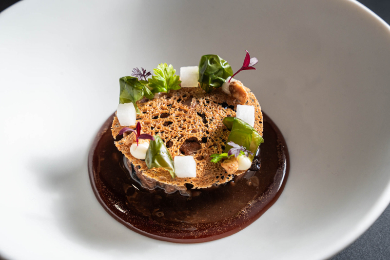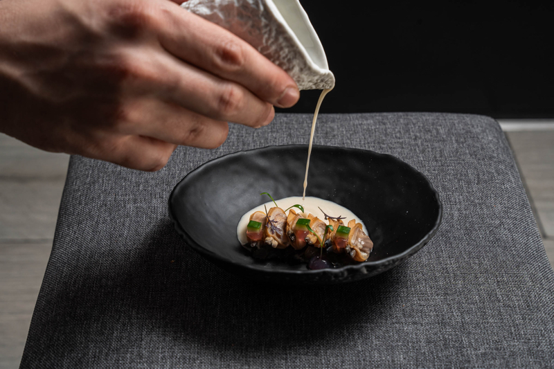 Por otro lado, el Menú Clásicos, valorado en 50 euros, se centra en platos representativos de la propuesta coquinaria de Hiu. Este menú incluye la Seta Eryngii y pak choi con majada de menta y cacahuete, las Kokotxas de bacalao y morro de cerdo en salsa verde, y el Arroz de salmorreta y trompetas de la muerte. Como broche final, la Torrija con helado de miso y caramelo hace un guiño al tradicional dulce semanasantero.
