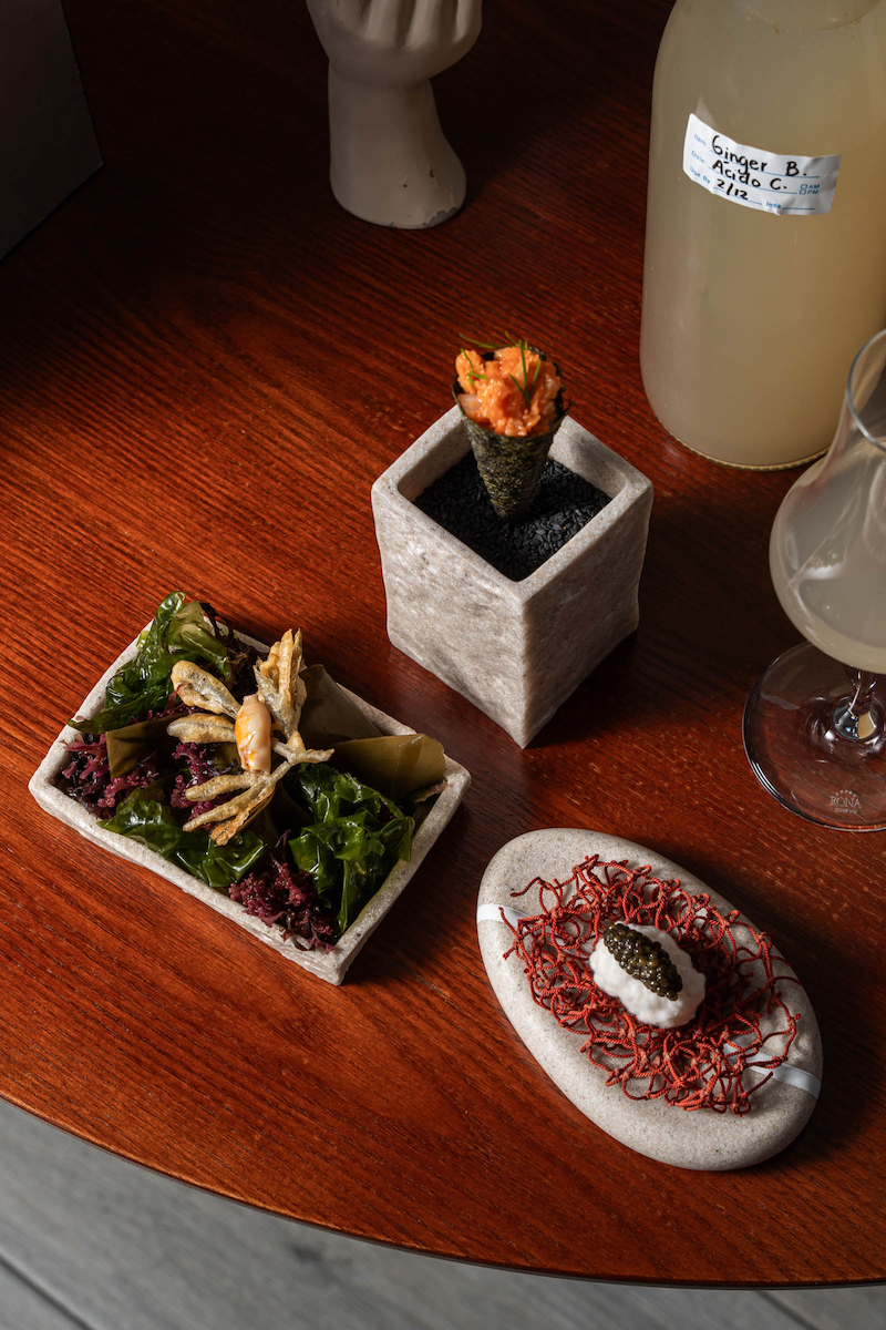 Niguiri de Koji, con caviar; Hinojo de mar con crema lacto fermentada de limón y navaja en escabeche; y Temaki de cecina con Kimchi catalán