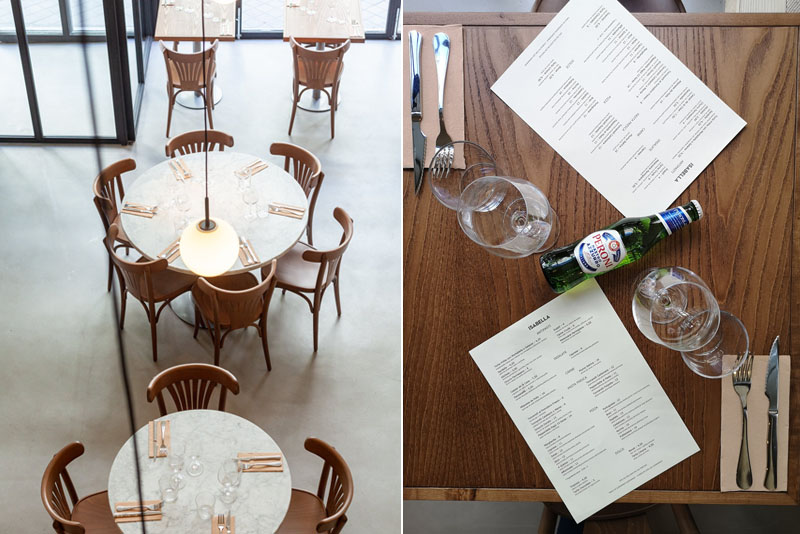En pleno barrio de Salamanca, el local del restaurante Isabella bien podría ser el de cualquier Soho. Son dos plantas abiertas desde un frontal de calle completamente acristalado que favorece más el confort en las noches de verano que en las desapacibles mañanas del invierno madrileño. El diseño, entre lo invisible y lo fabril, corre por cuenta del estudio Plantea. Tuberías de ventilación, vigas y escalera esquemática de acero, suelo industrial, paredes de ladrillo repintadas…