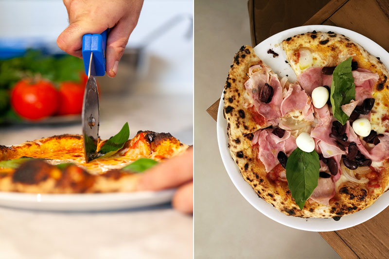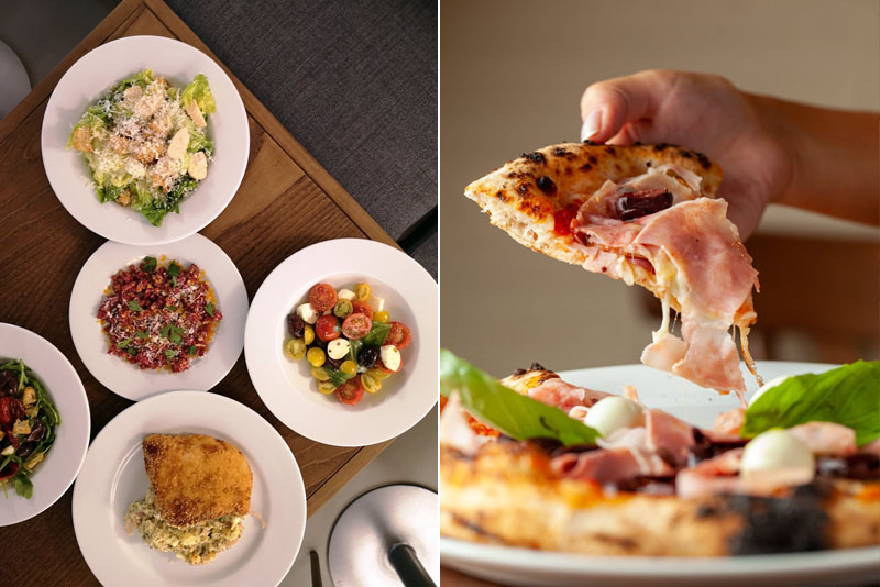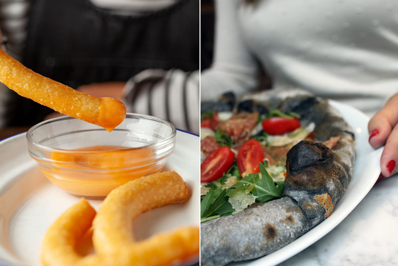 Imagen superior: churro parmesano y pizzas de carbón vegetal del restaurante Isabella