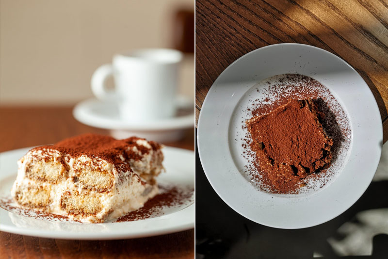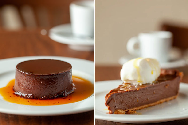 Imágenes superiores: el tiramisú, el Flan Bonet y la tarta de chocolate en el restaurante Isabella