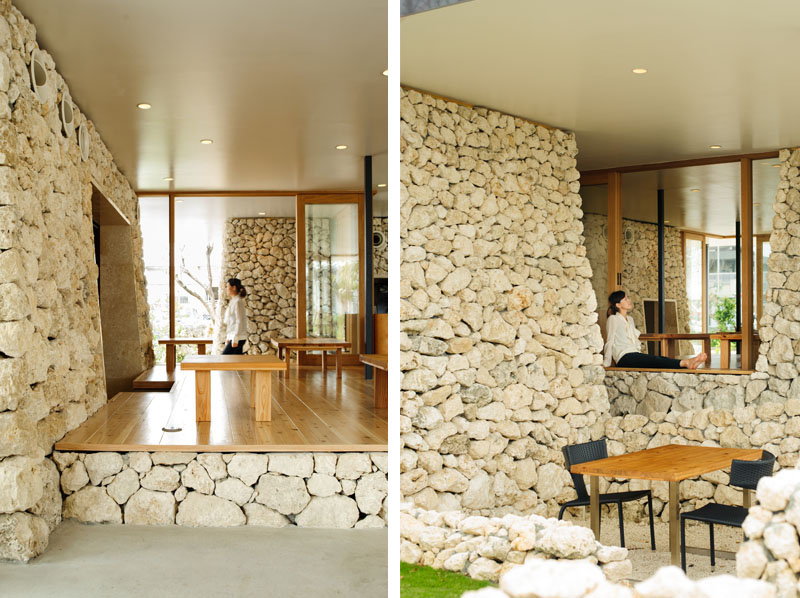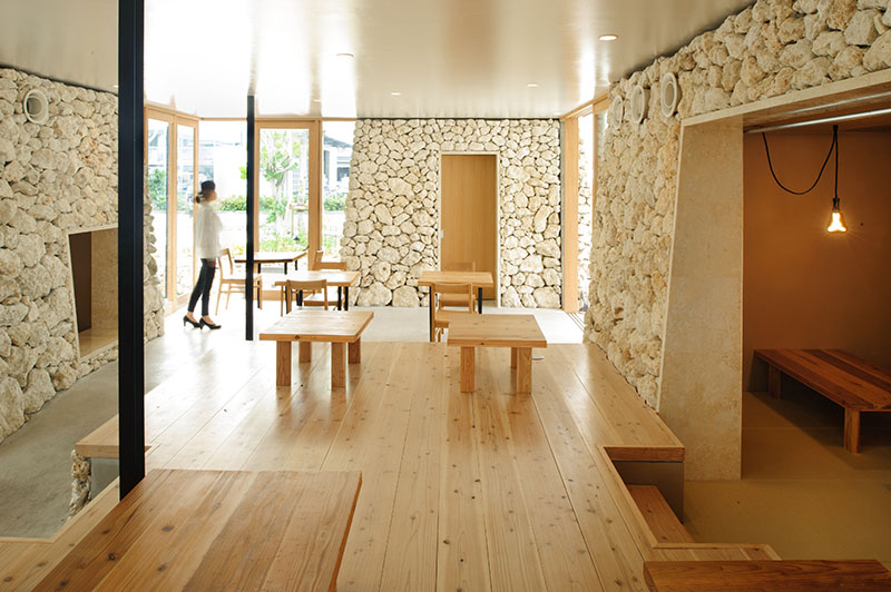 El restaurante Itoman Gyomin Shokudo de YKDW-Yamazaki Kentaro Design Workshop consigue establecer un vinculo emocional con el lugar, tanto experiencial para el visitante como para los habitantes pues fue construido como actividad de un taller de albañilería organizado por los colaboradores del proyecto.