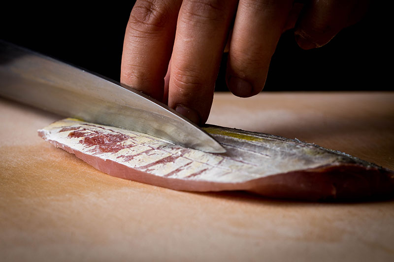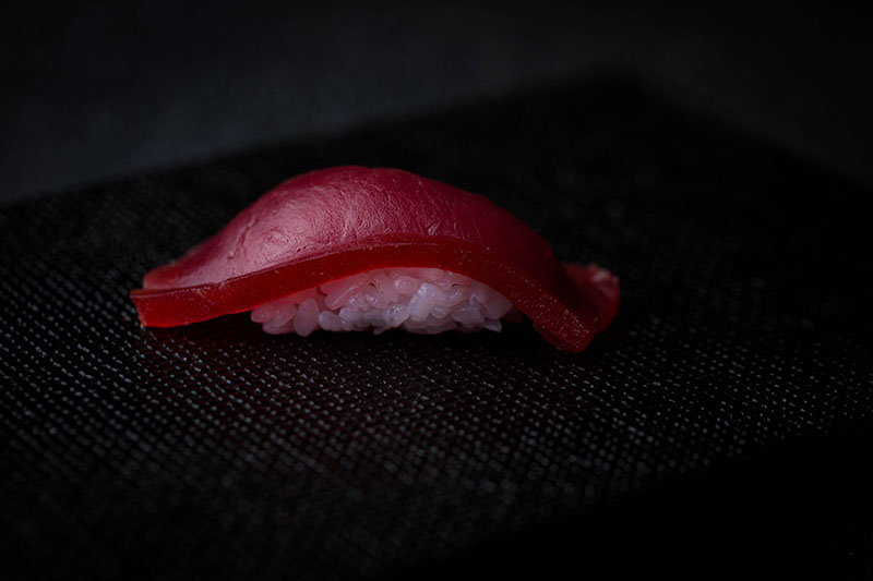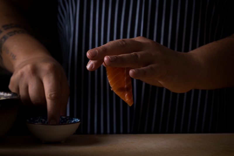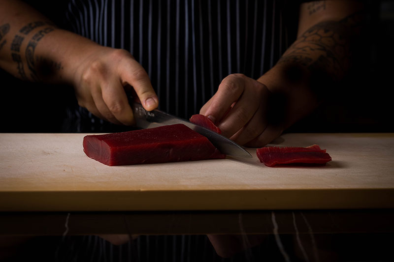 Imágenes superiores: Mario Payán cortando pescado en Kappo para sus nigiris delicados