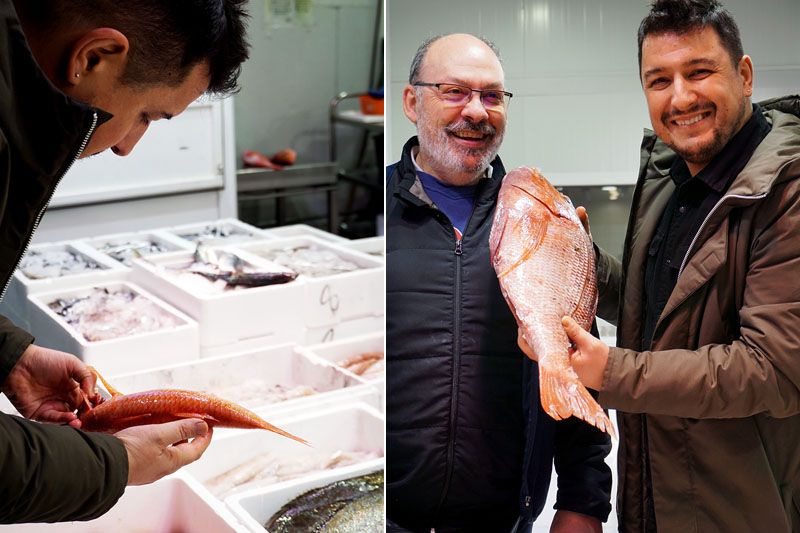 Imagen superior: Mario Payán en Mercamadrid seleccionando salmonetes y posando con una bonita urta