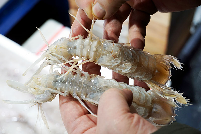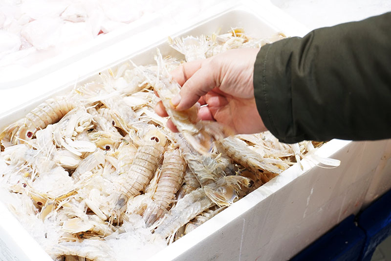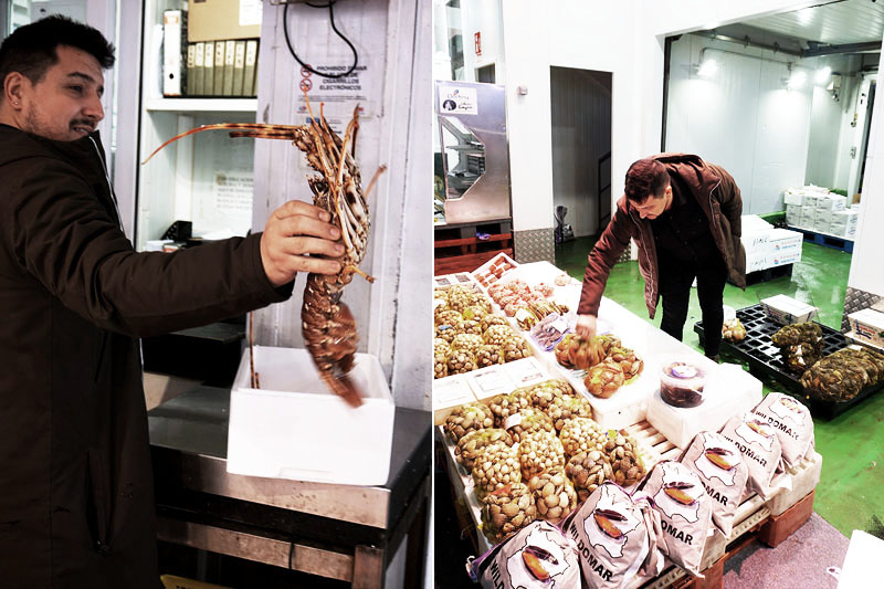 Continuamos la ronda hasta donde están los cubos de anguilas vivas, elementos inviables de no ser por la presencia de clientela china. Con el aplomo que le caracteriza, Mario asegura hacer la mejor de la ciudad. También echamos un ojo al bogavante azul y a las galeras que él utiliza para un arroz que sólo de contarlo nos hace salivar después de haber cenado hace ya horas. Con una hembra y un macho en las manos, nos explica que a pesar de que a la gente le gusta más la primera por las huevas, siempre el macho está más lleno de chicha. Hace acopio de algunas conchas que sí cargará él mismo y tiramos a ver a Juan, el más fuerte en percebes, aunque a él no le pirren demasiado. Allí los tiene de todas las divisiones, desde 45 a 120 o 180 euros. Prefiere las langostas, con las que es generoso porque el comensal español, según él, es mucho de envidia. Langosta ve, langosta quiere. Mario las prepara para sashimi con sake.