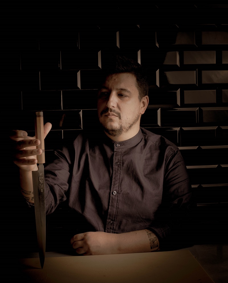 Imágenes superiores: Mario Payán preparando nigiris y posando con uno de sus queridos cuchillos japoneses artesanos