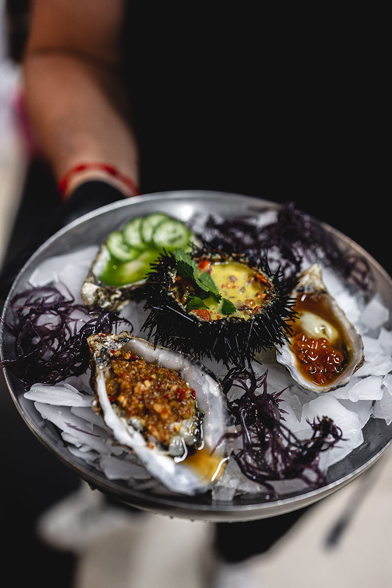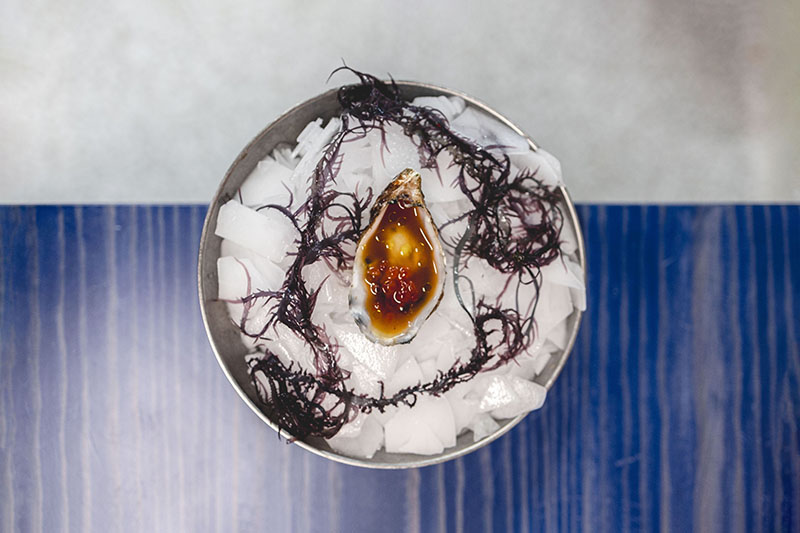 Imágenes superiores: 1) Una de sus ostras aliñadas 2) La barra para 7 personas