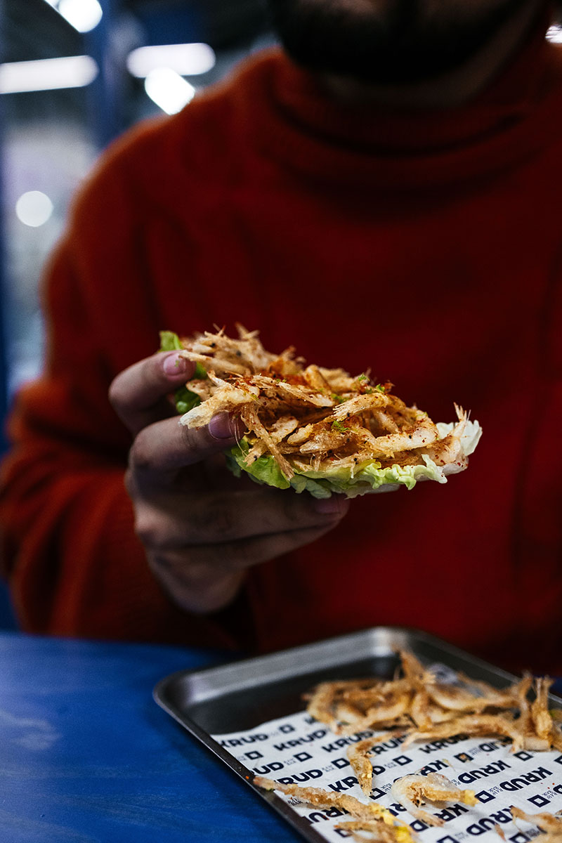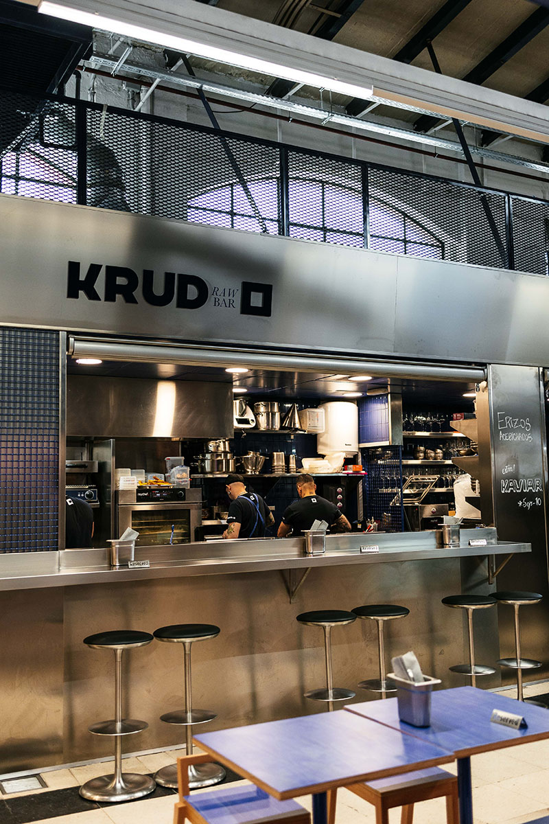 Krudo ocupa lo que hasta hace poco fue un puesto dentro del Mercado de Vallehermoso, convirtiéndose en un espacio gastronómico animado y lleno de energía. Su epicentro es una barra de metal con capacidad para siete comensales, un lugar privilegiado desde donde se puede observar todo el proceso culinario en acción. El equipo de cocina, bien coordinado a pesar del reducido espacio, trabaja con agilidad y precisión, ofreciendo un espectáculo tan dinámico como su propuesta gastronómica.