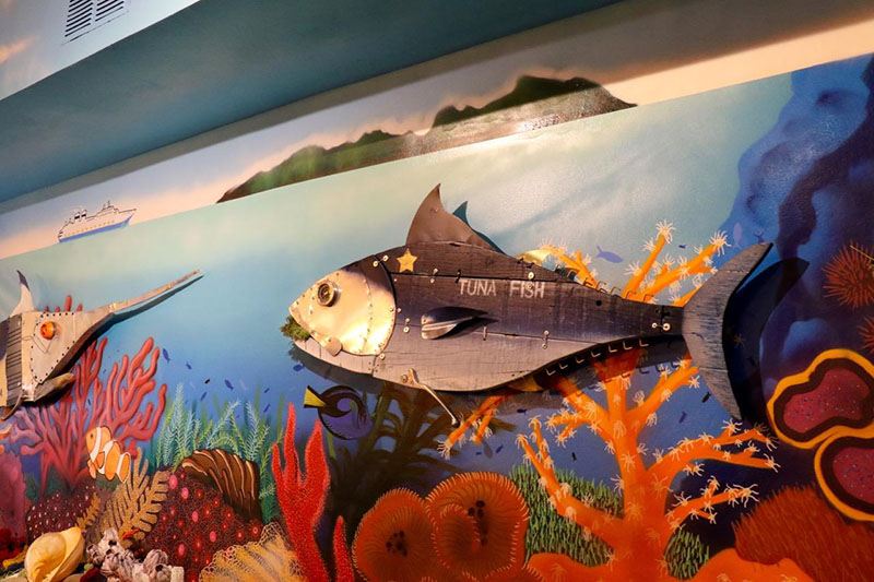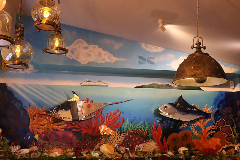 Imagen superior: atún de reciclaje en el mural del restaurante Kultura Kuisine