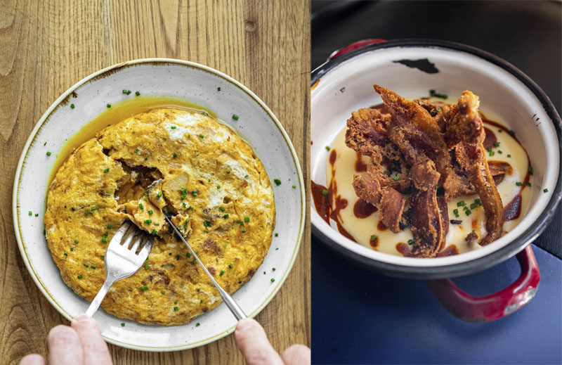 Imágenes superiores: Tortilla de patatas y mejillones, Oreja crujiente y Arroz Meloso con Setas.