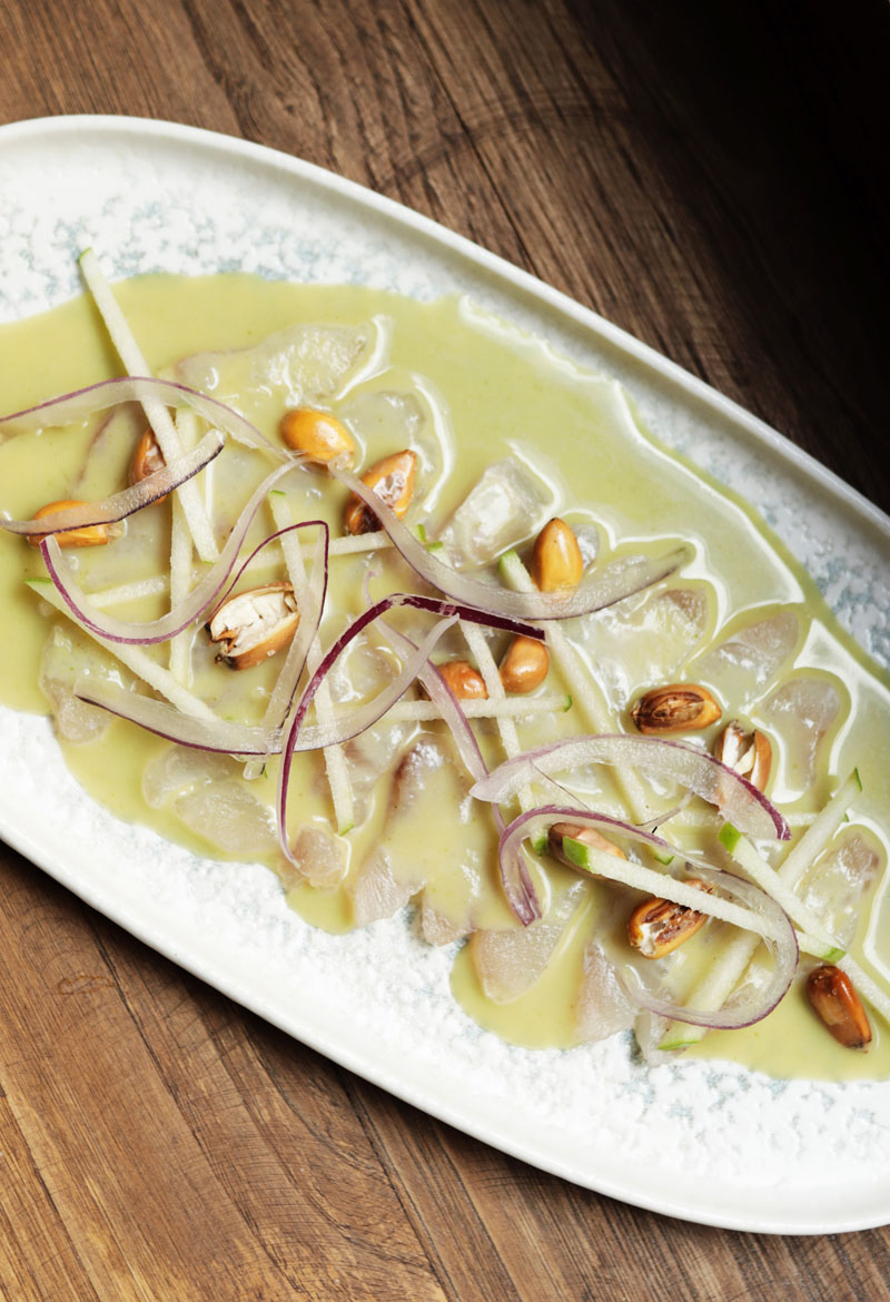 Imagen superior: Pez limón con leche de tigre nikkei, manzana verde, cancha y cebolla