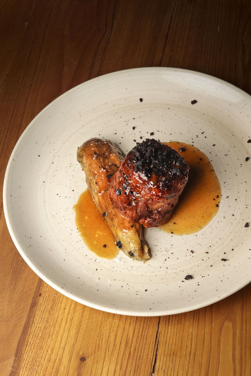 Imagen superior: Cordero meloso en su jugo con miel y berenjena a la llama