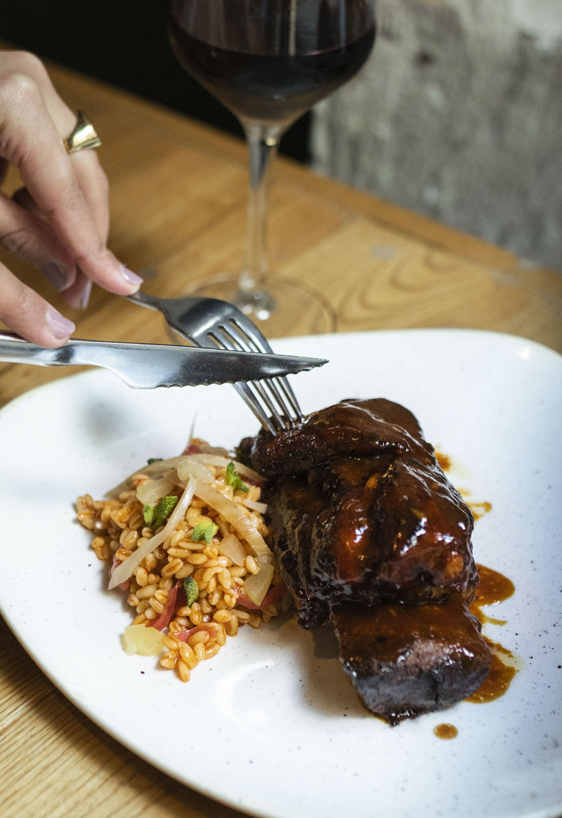 Imagen superior: Costilla de ternera añeja glaseada con cereza fermentada, trigo tierno y encurtidos