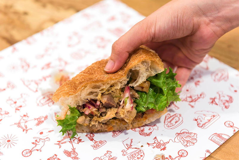 Pero hemos venido a zampar bocadillos, así que nos obligamos a probar el hit de la casa: La Porca, esto es, carne de cerdo asado (“3 horas de amor a 150º”) acompañada de pesto de tomates secos, cebolla roja marinada con lima y reducción de vermú casero. Viene dentro de una crujiente torta de cristal.