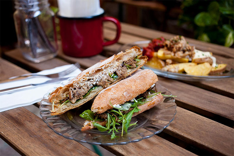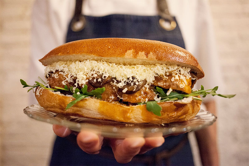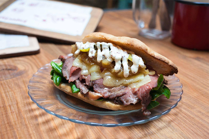 Rosbif de lomo bajo, queso St. Nectaire, cebolla caramelizada, encurtidos caseros, mayonesa Dijon. Lo aguanta un mollete de Cloudstreet Bakery.