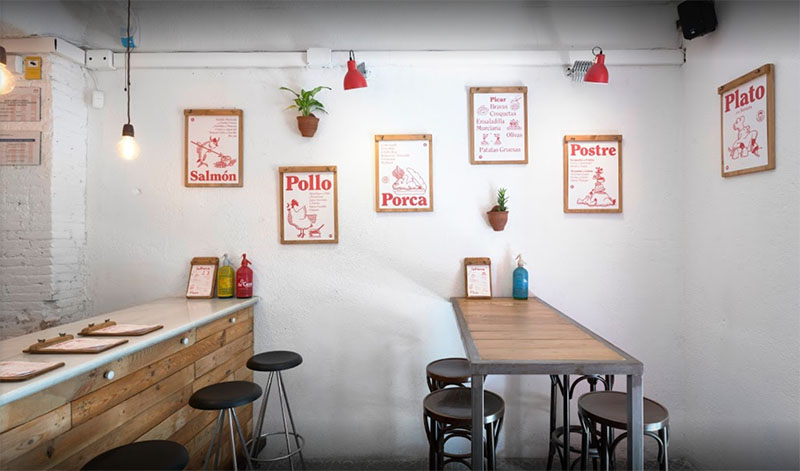 Desde el Paralelo hasta Monjuic, enfilando las primeras cuestas del barrio, vemos el letrero y las puertas de madera con las imágenes de la ilustradora Olga Capdevila. El rojo es el color de La Porca, un proyecto impulsado por Rubén León que, junto a su amigo el diseñador Guiye Comín, dio el salto del blog gastronómico Stomako a la realidad del contacto directo. Tras un viaje iniciático por Colombia y Perú y sin más idea que la de haber mamado la cocina de su madre, Rubén montó este pequeño restaurante que se basa más en la tradición barcelonesa de los entrepans, al estilo de La Taverna dels 11 y Entrepanes Díaz, que en algo como La Porcinería de Madrid, ya glosada en una de nuestras entradas anteriores. Con un puntazo latino reconocible, además.
