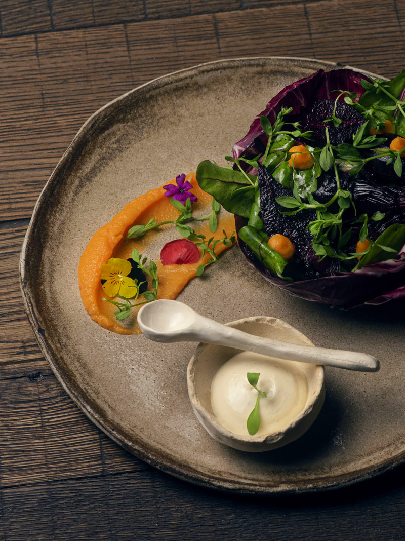 Fotografía superior: Ensalada de achicoria, zanahoria, remolacha, espinacas, apio nabo con aliño Caesar