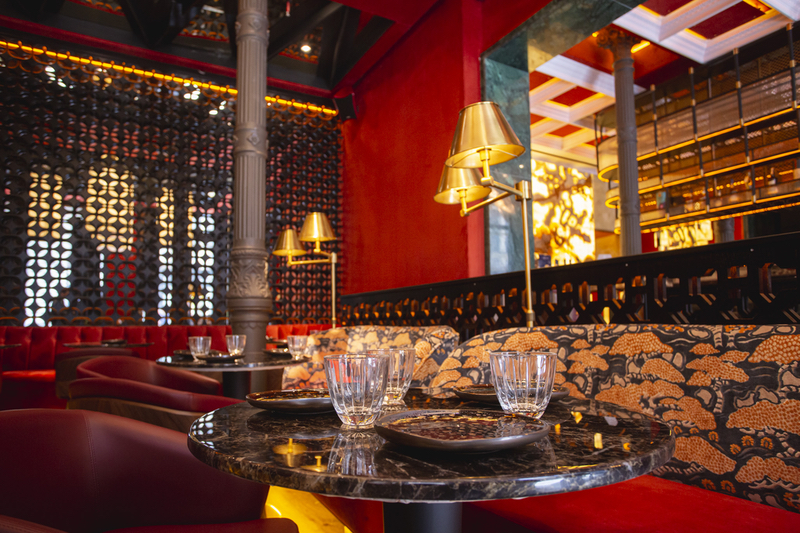 El diseño interior del restaurante, a cargo del renombrado Jean Porsche, rinde homenaje tanto a la esencia del Madrid del siglo XIX como a la actualidad cosmopolita. La combinación de terciopelo y biselados con las paredes de mármol crea un ambiente acogedor y lujoso, que se adapta perfectamente tanto a la vida nocturna como diurna.