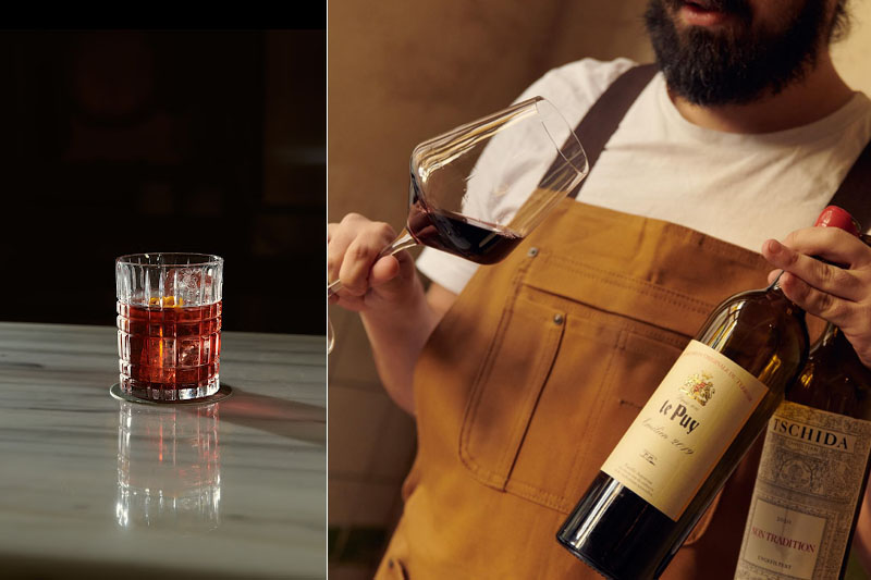 Imágenes superiores: Mesa en la planta sótano / Negroni Bachiche y botellas de vino… natural y de “bajaintervención”