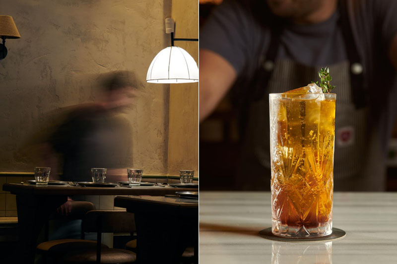 Imagen superior: Mesa de noche y cóctel F*ck Aperol, un spritz en formato highball