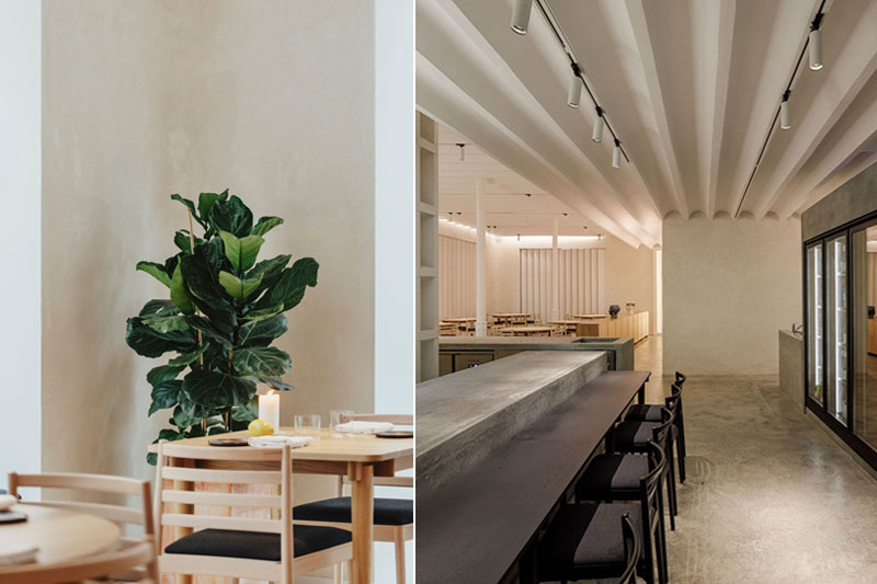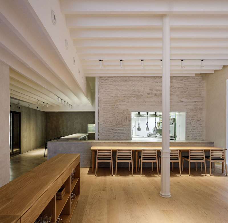 La cocina, insertada en los muros de ladrillo, acapara la atención al comunicarse a través de sus dos perforaciones. Enfrentada en su perímetro, la barra son dos volúmenes esquemáticos de hormigón que acercan lo andaluz más informal a lo oriental más ritual y solemne.
