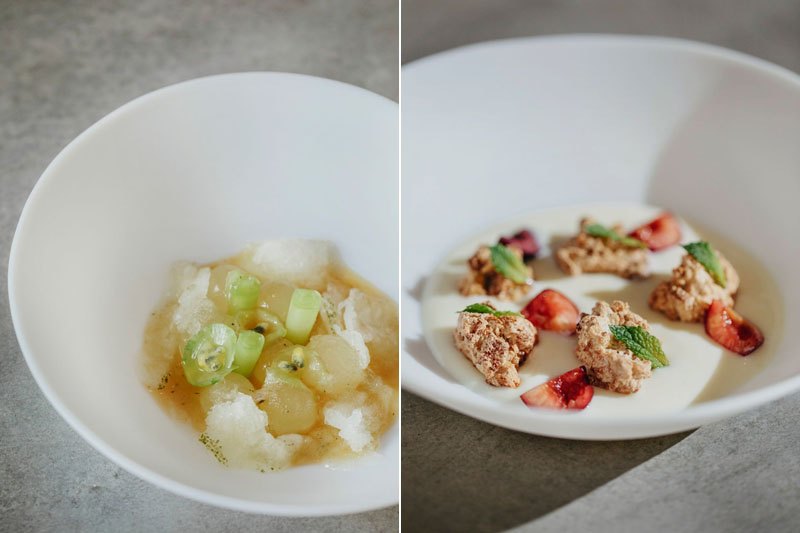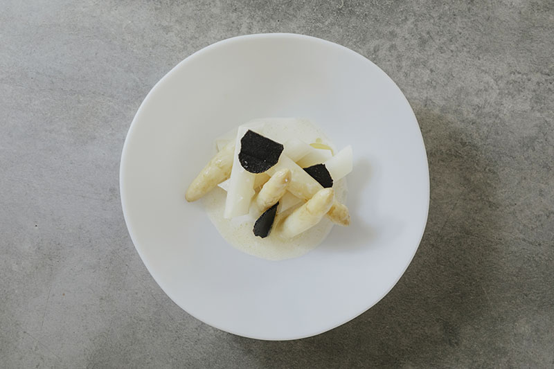 Imágenes superiores: Espárragos blancos, emulsión cítrica y trufa negra / Tartar de gamba blanca de Huelva en terrine de oreja de cerdo ibérico