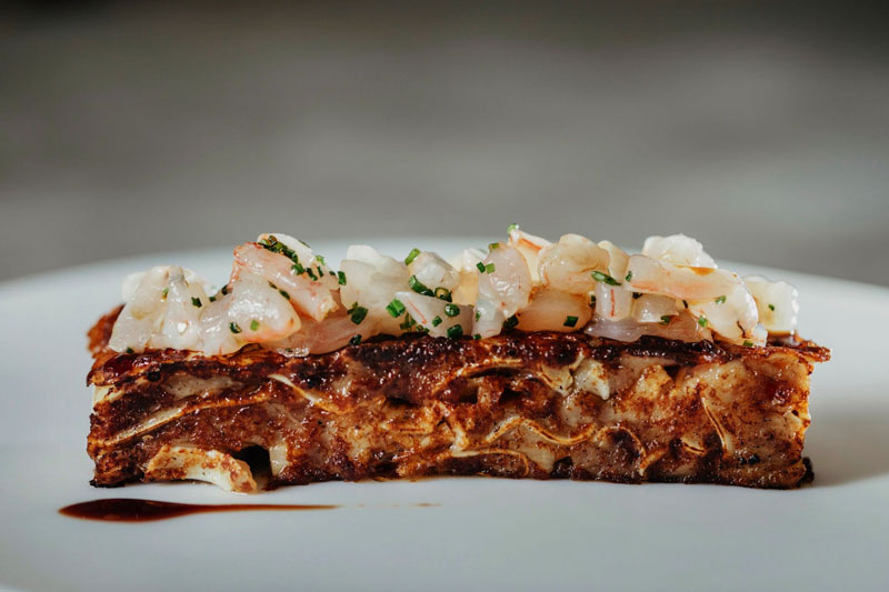 La lubina (de estero de Barbate) Song Shu Yu al adobo, que se presenta abierta con un corte chino y adobada en pimentón de Ávila, o el tartar de gamba blanca de Huelva en terrina de foie de cerdo ibérico se eligen como primeros junto al tartar de vaca retinta de crianza ecológica de la Sierra de Cádiz cortado a cuchillo y aliñado al momento.