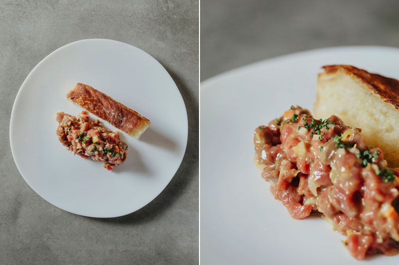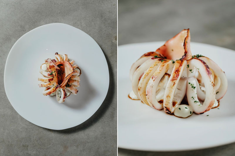 Imágenes superiores: Steak tartar de vaca retinta de crianza ecológica / Calamar a la brasa, ali-oli