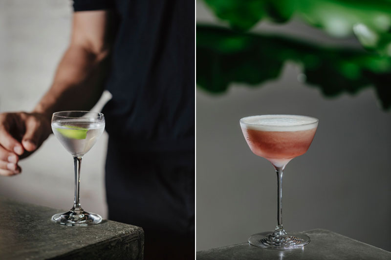 Imágenes superiores: Los dulces de Meridional / Cócteles Pisco sour de ruibarbo y shiso, y Gimlet / Detalles de interior
