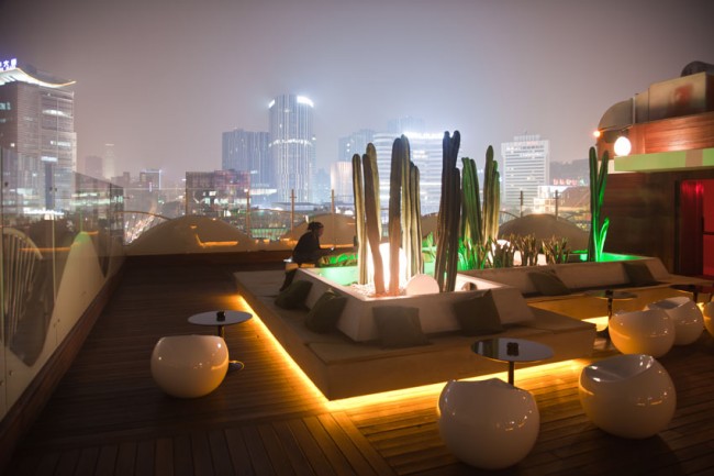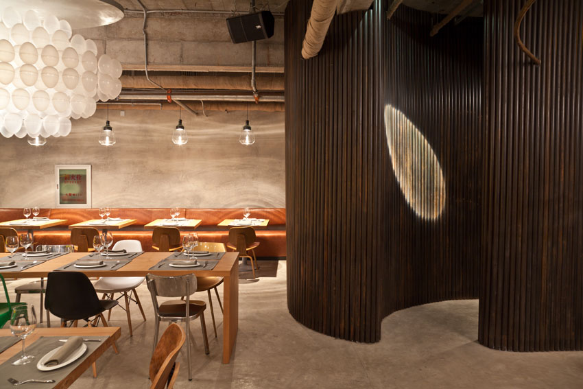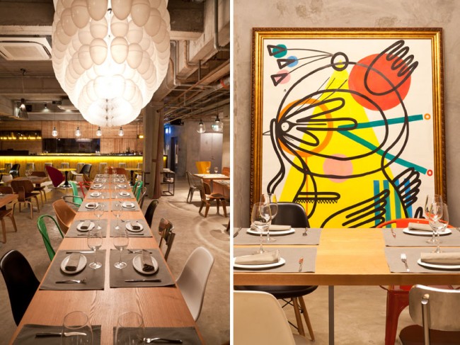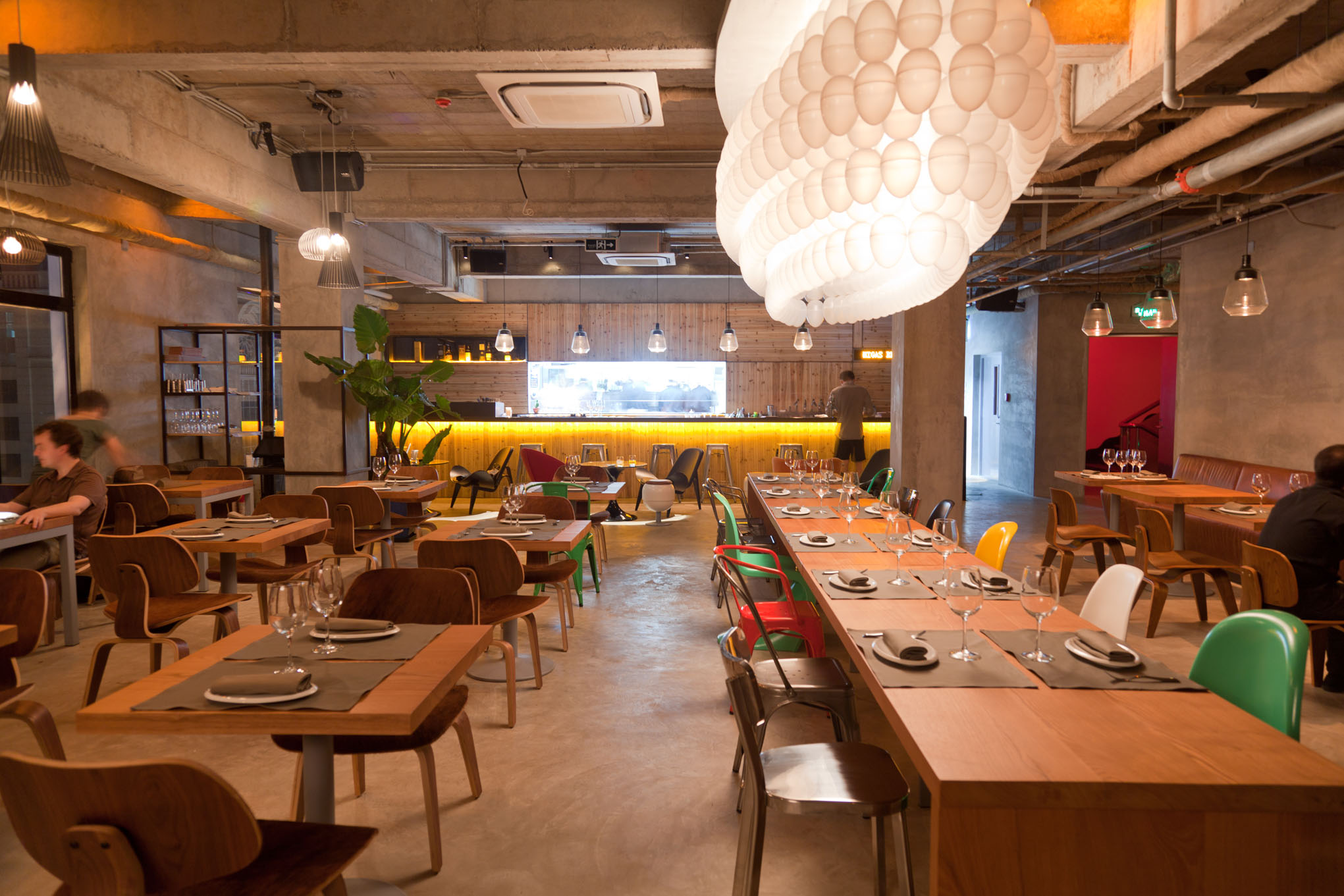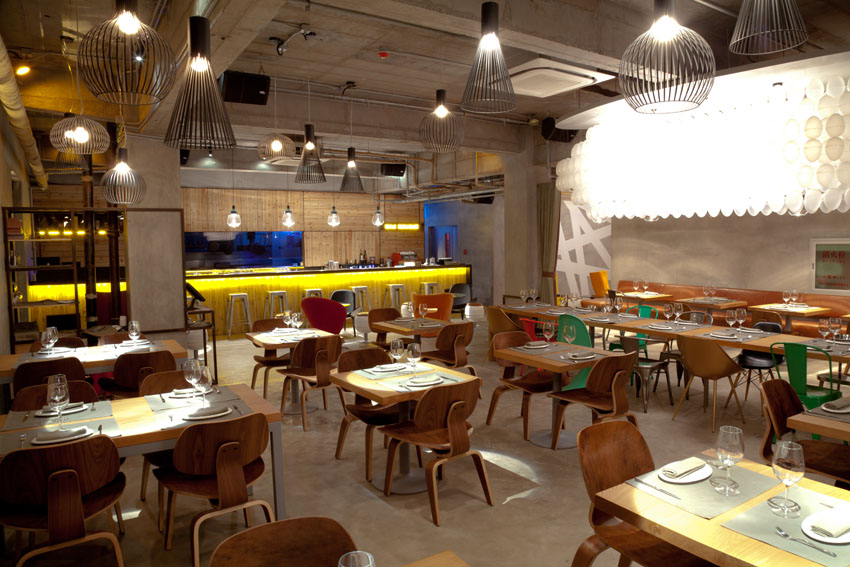 Nos acaba de enviar Alfonso de la Fuente, más conocido por Pichiglas, su último proyecto de interiorismo. Es un restaurante, se llama Migas y está ubicado en el ático del edificio Nali Patio en Beijing, China.“Eduardo García el propietario y Sixe el diseñador gráfico habían decidido hacer un huevo como logotipo, así que les comenté que podríamos seguir con la idea en el diseño de interiores” nos comenta Alfonso. El espacio, está en una sexta planta y cuenta con 300 metros cuadrados en su interior. “Dejamos la estructura de hormigón, tubos e instalaciones a la vista para darle un punto industrial, ya que luego le añadiríamos un punto más cálido con el mobiliario, la iluminación y los cuadros de Sixe”. El restaurante cuenta con una terraza de 400 m2, con vistas de 360 grados al centro de Beijing. “En el interior, hay algunas piezas diseñadas por mi, como las mesas de nogal y una gran lámpara de suspensión” Detrás de la cocina del Migas está Aitor Olabegoya, un joven y reconocido cocinero.