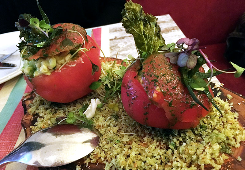 Imagen superior: tomates marinados, tartar de aguacate y polvo de albahaca @restaurante Morgana