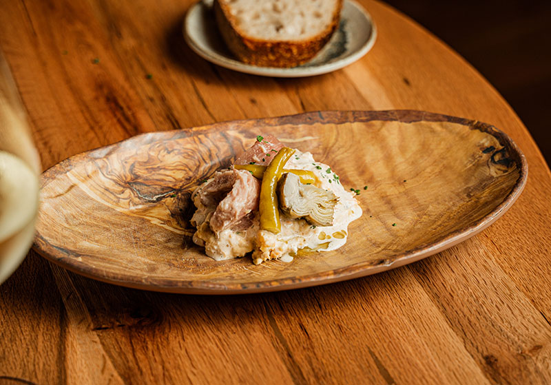 Imagen superior: Ensaladilla rusa en Moscatel, con ventresca casera de atún rojo