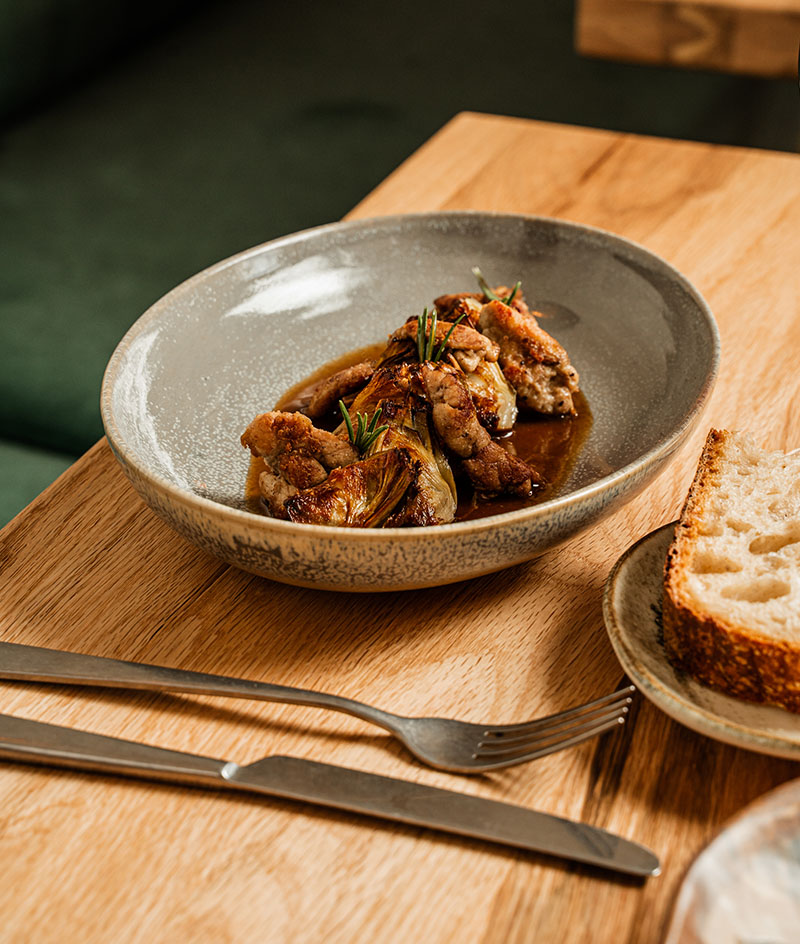 En la sección de huerto encontramos platos como la Parrillada de verduras, langostino al panne y romesco (18€), una combinación de sabores y colores que deleita el paladar. Otra opción son las Alcachofas a la plancha con mollejitas de cordero (22€), un plato para los amantes de la casquería, donde contrasta la suavidad de las mollejas con toque crujiente de las alcachofas.