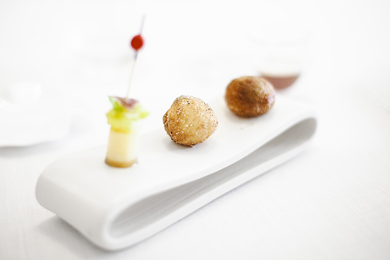 Asier, sumiller de Nerua, nos recibe con una copa de champagne Cristophe Mignon ADN. Comenzamos los aperitivos con un caldo de berza, muy aterciopelado, al que le sigue un buñuelo, cuya masa es elaborada con sifón, haciendo de esta, una masa muy volátil. Acabamos los aperitivos con un grillo, un pincho en peligro de extinción, donde la sencillez es llevada al extremo, una combinación de cogollo, patata y el aliño que funciona muy bien.