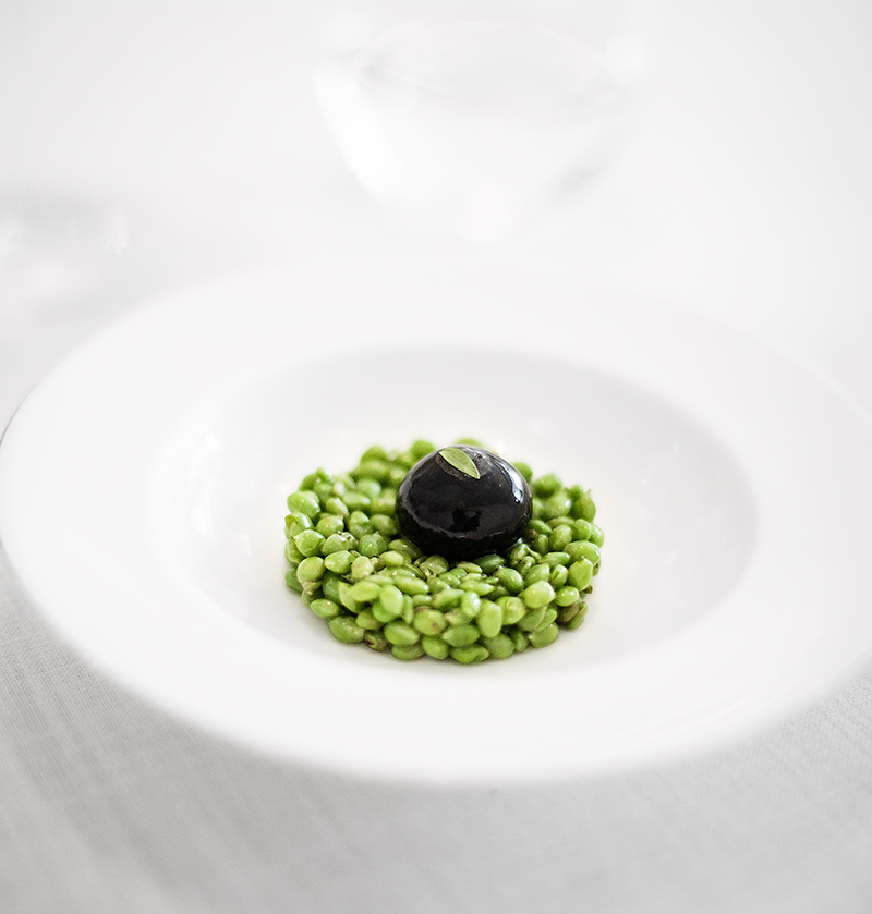 Guisante lágrima con esferificación de guiso de tinta de calamar.