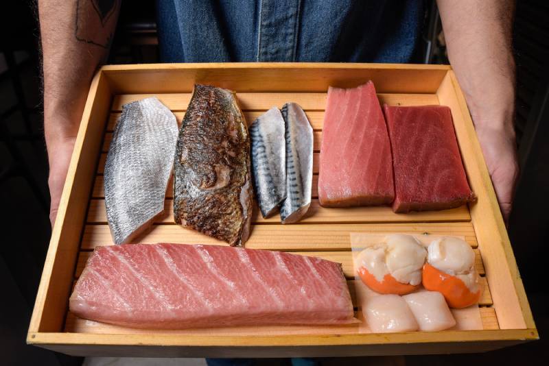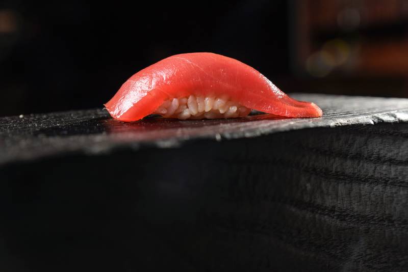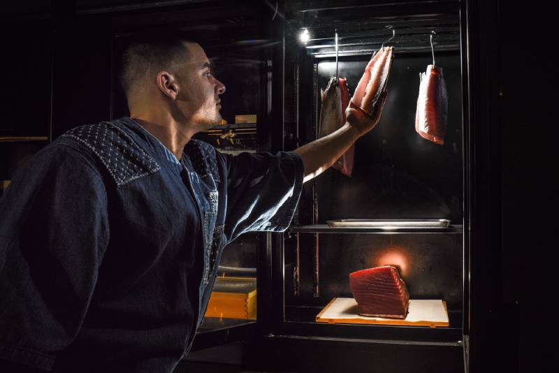 Uno de los secretos de Adrián es cómo prepara el pescado. Tras ser capturado, este se madura en una cámara propia, aquí cada pieza obedece a tiempos distintos — el chutoro, un músculo entre la ventresca y la entraña de atún rojo, se madura unos 20 días — .“Limpieza, desangrado, temperatura y humedad, eso es lo más importante”. Una vez que se ha entendido todo eso bien, “lo siguiente es la experiencia”, explica. La finalidad es conseguir una textura agradable, dando lugar así al umami o quinto sabor.