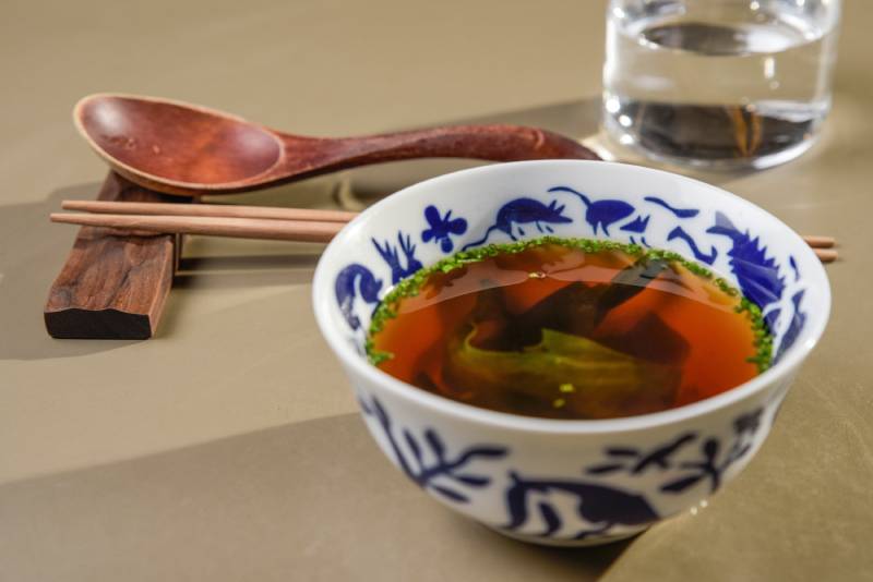 En este local, marcado por los materiales nobles, todo tiene su razón de ser y está cuidado al detalle. Por eso, no es de extrañar que el dashi en Omakase se sirva en un cuenco de porcelana de la firma Sargadelos. “Intento que todos los platos y menaje de cocina, así como utensilios de madera sean elaborados en Galicia. Me gusta, sobre todo, incluir piezas de artesanos locales menos conocidos, que han sido hechas en talleres a tan solo dos manzanas del restaurante”. Galicia Calidade ante todo.