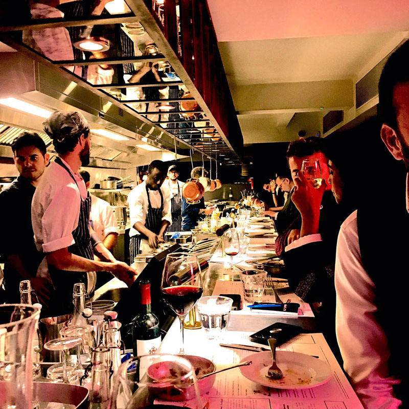 Si quieres ver a Tomer en acción, mejor sentarse en la barra. Hay 16 butacas con vista directa al espectáculo culinario, donde jóvenes camareros y barmen también juegan un papel clave, llenando copas y charlando con los clientes, creando un ambiente de fiesta en este íntimo local del Soho.