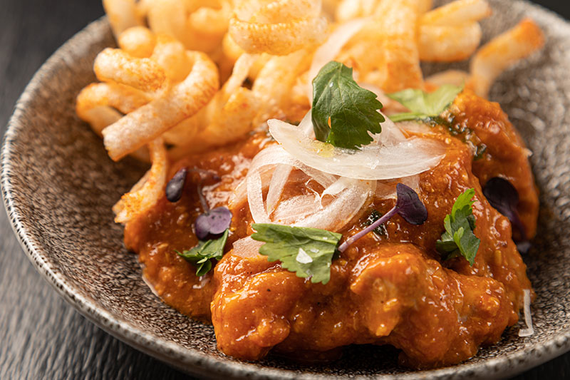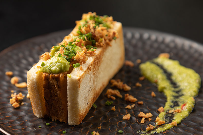 Su carta se divide entre fríos y calientes. En el primer grupo nos encontramos con el Tiradito de lubina con ají amarillo (11,90€), junto a las Milhojas crujientes de escalibada y boquerón (7,90€) o la Ensaladilla cremosa de gambas (9,95€). En el segundo grupo, tenemos ejemplos como como el plato icónico de la casa que es el Cachopín de ternera blanca con Ibérico y San Simón da Costa (10,90€). Muy llamativo también el Cordero estilo Tikka masala (12,25€), la Orejita a nuestra manera (10,50€) que es un plato perfecto para aquellos que se inicien en la casquería ya que se trata de un bocadillo en pan brioche con un crujiente relleno y el toque picante de la salsa brava.