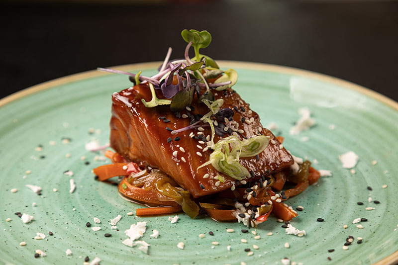 Salmón teriyaki con verduritas al wok