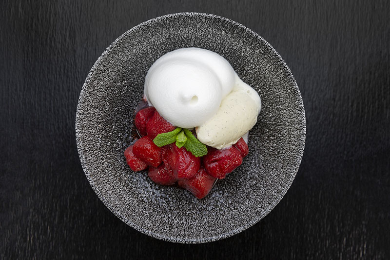 Imagen superior: Fresas estofadas con espuma de leche de caserío anisada