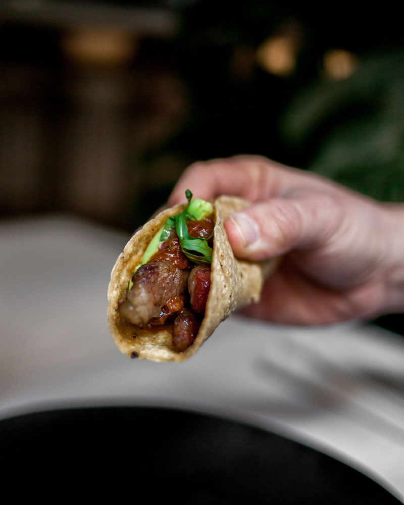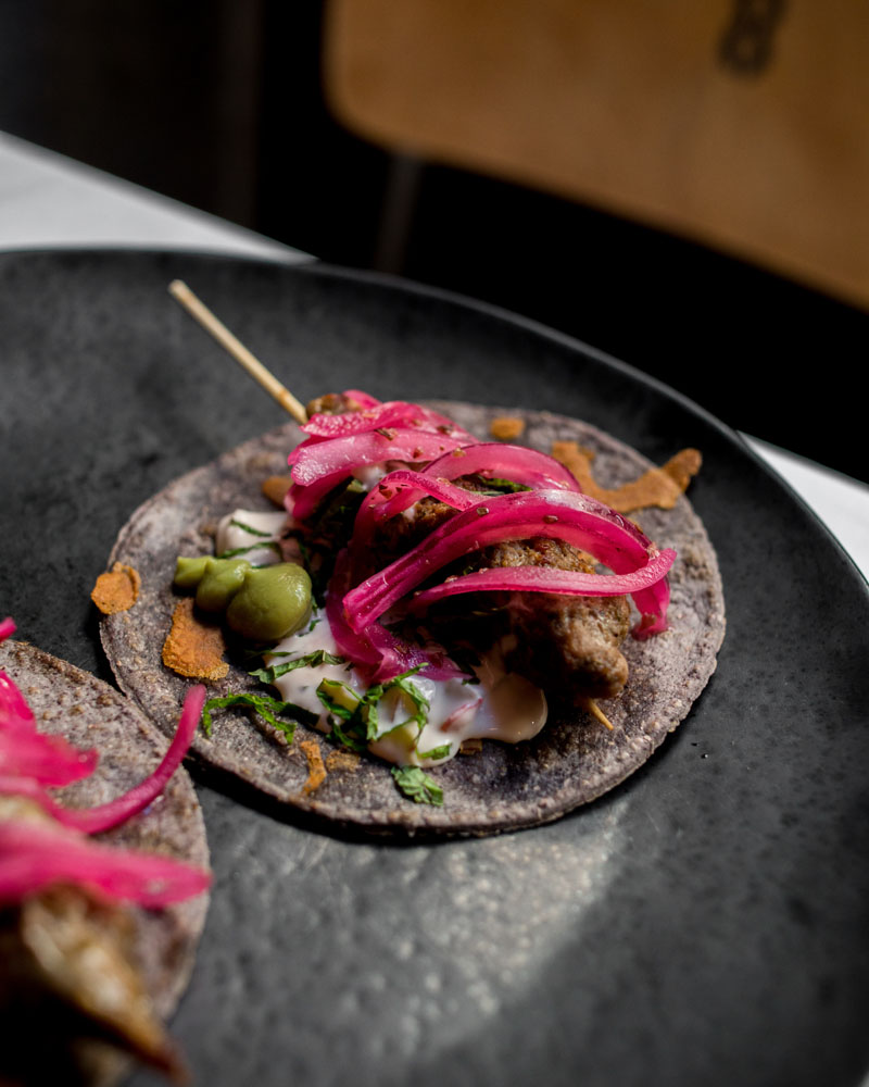 Imagen superior: Taco Libanés con cordero, cebolla morada, hierbabuena y salsa tártara