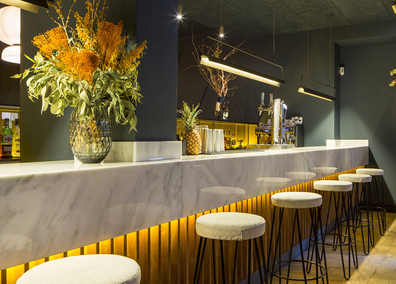 El local fue anteriorimente un restaurante y se ha aprovechado el suelo de microcemento existente y la barra de mármol, aunque ésta se ha forrado con listones de madera para aportar mayor calidez. Unas lámparas, en latón y papel, marcan el espacio reservado para disfrutar de la experiencia gastronómica en la barra.