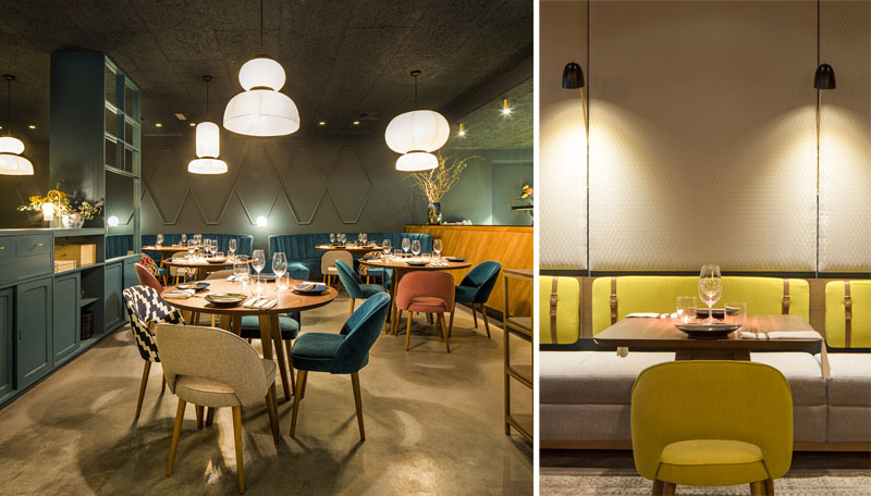 También destacan los sofás redondos de terciopelo azul, que marcan un espacio más privado y nos trasladan a los clubs y reservados de Nueva york de los años 30. Esta zona está iluminada con lámparas de pie IC de Flos diseñadas por Michael Anastassiades. Aportan un luz tenue, que crea una atmósfera cálida y focalizada en cada plato.